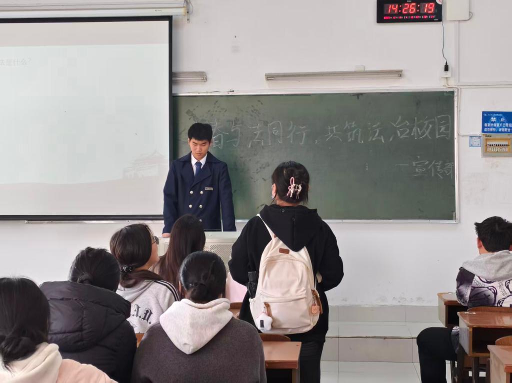 我校法治宣传日专题宣讲活动圆满举行为深入学习宣传贯彻习近平法治思想,提升师生法治素养,12月11日,我校以“弘扬法治精神 建设法治中国”为主题的法治宣传日专题宣讲活动在第二教学楼204教室开展。本次活动由系宣传部主办,各院系23至25届学生代表参与,通过系统宣讲、案例解析与互动问答,让法治理念深入校园。