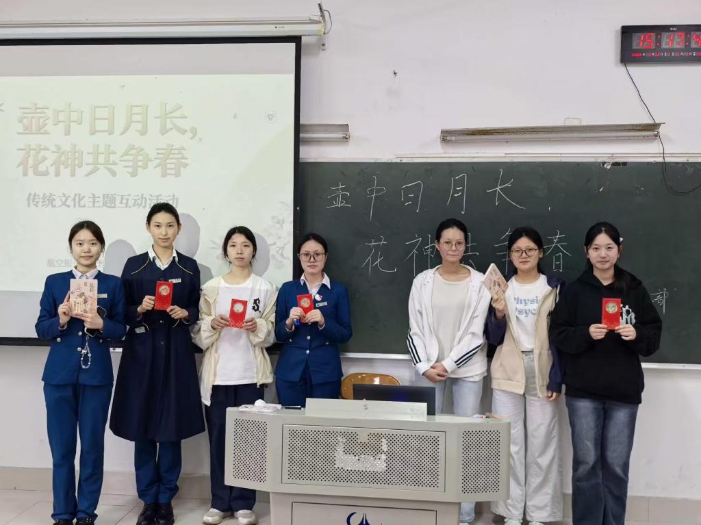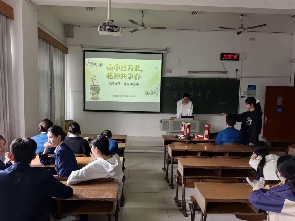 为传承弘扬中华优秀传统文化,厚植学生文化底蕴,丰富课余文化生活,营造文雅和谐、底蕴丰盈的校园文化氛围,4月23日,航空服务与管理学院于二教205教室成功开展“壶中日月长,花神共争春”传统文化主题活动。本次活动立足传统民俗文化资源,以趣味竞技创新文化传播形式,引导学子沉浸式体悟古典民俗魅力,助力传统文化浸润校园、涵养青年品格。