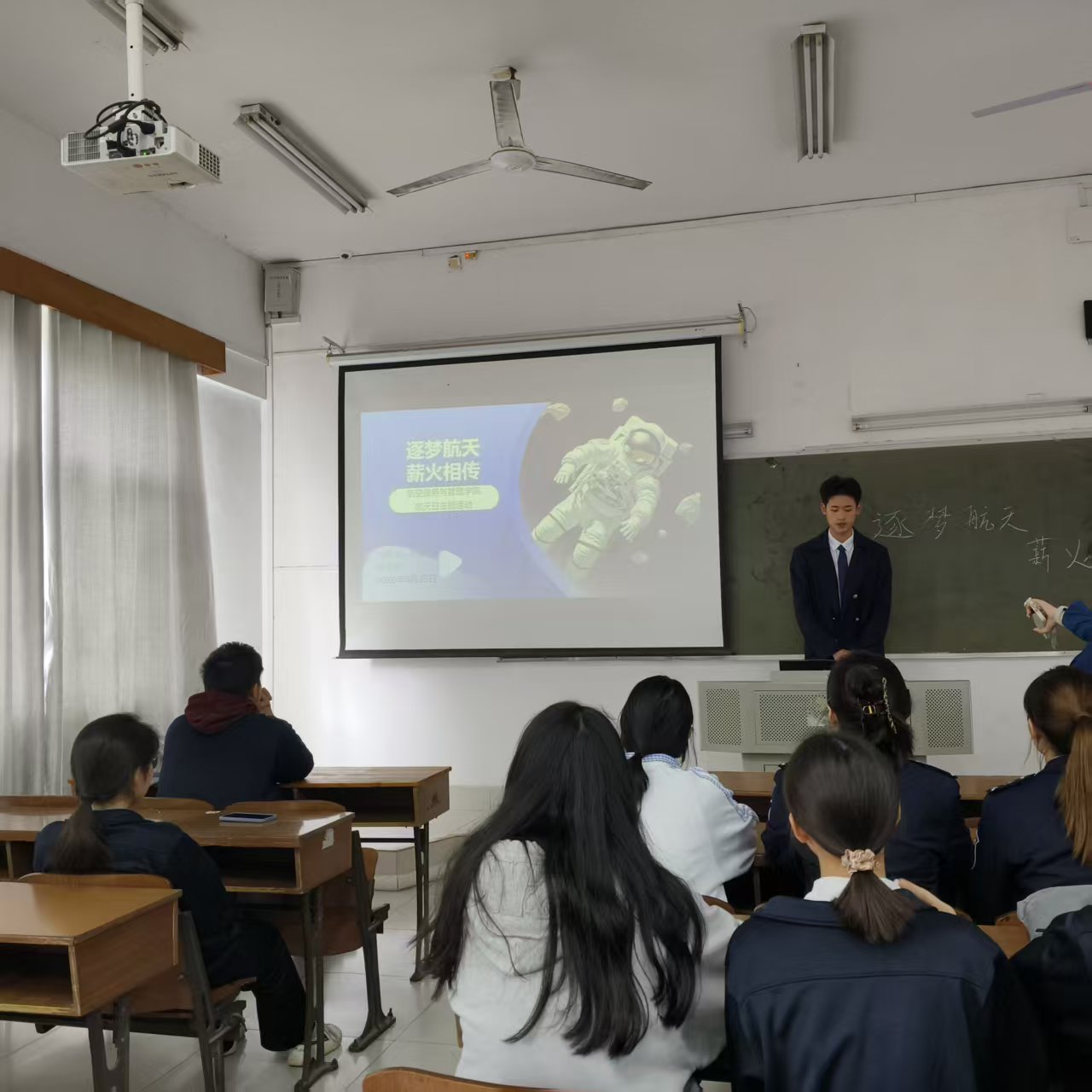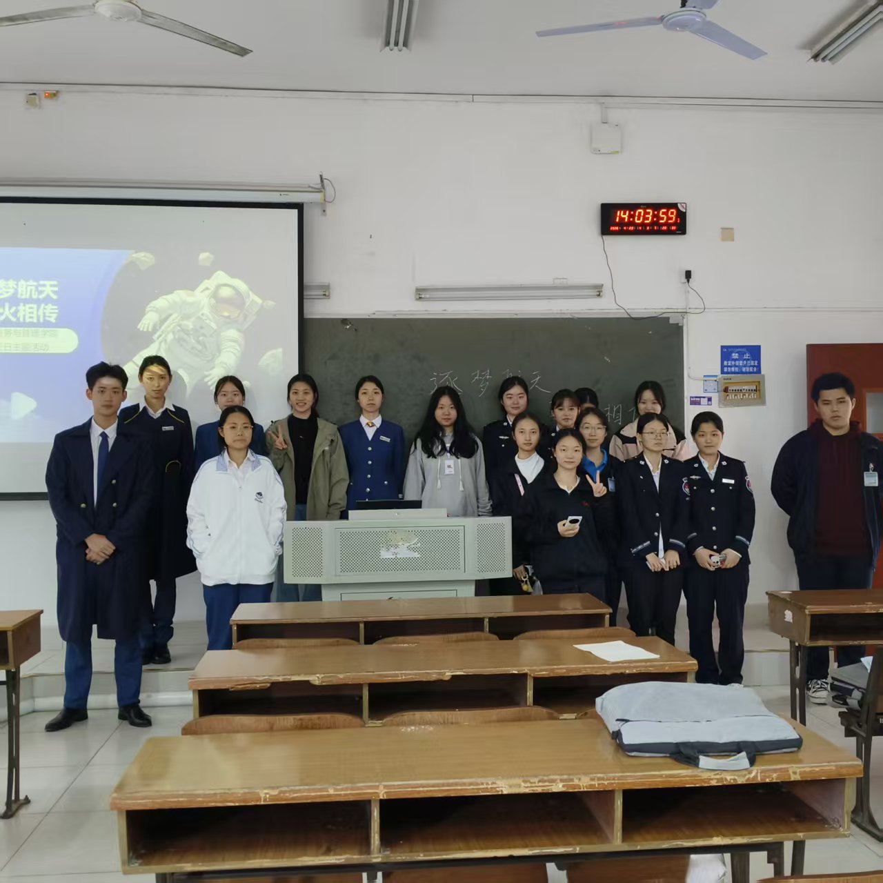 为大力弘扬伟大航天精神,全面普及航天科普知识,厚植航空服务与管理学院全体师生的家国情怀,强化专业职业使命感与行业责任感,2026年4月23日,在二教203顺利举办“逐梦航天,薪火相传”主题教育活动,学院全体师生积极参与。